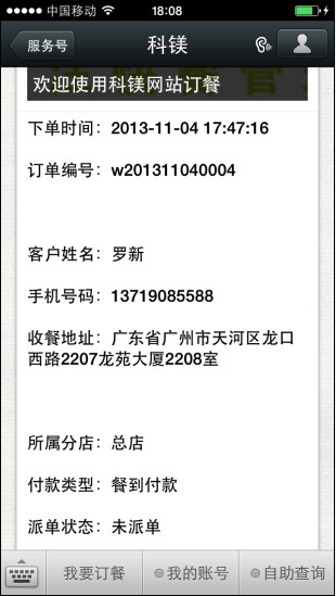 客戶可以根據(jù)自己的訂單號,查詢送餐狀態(tài),是否已經(jīng)送出,也可以根據(jù)時(shí)間查詢自己的歷史訂單,消費(fèi)次數(shù)及消費(fèi)總金額。